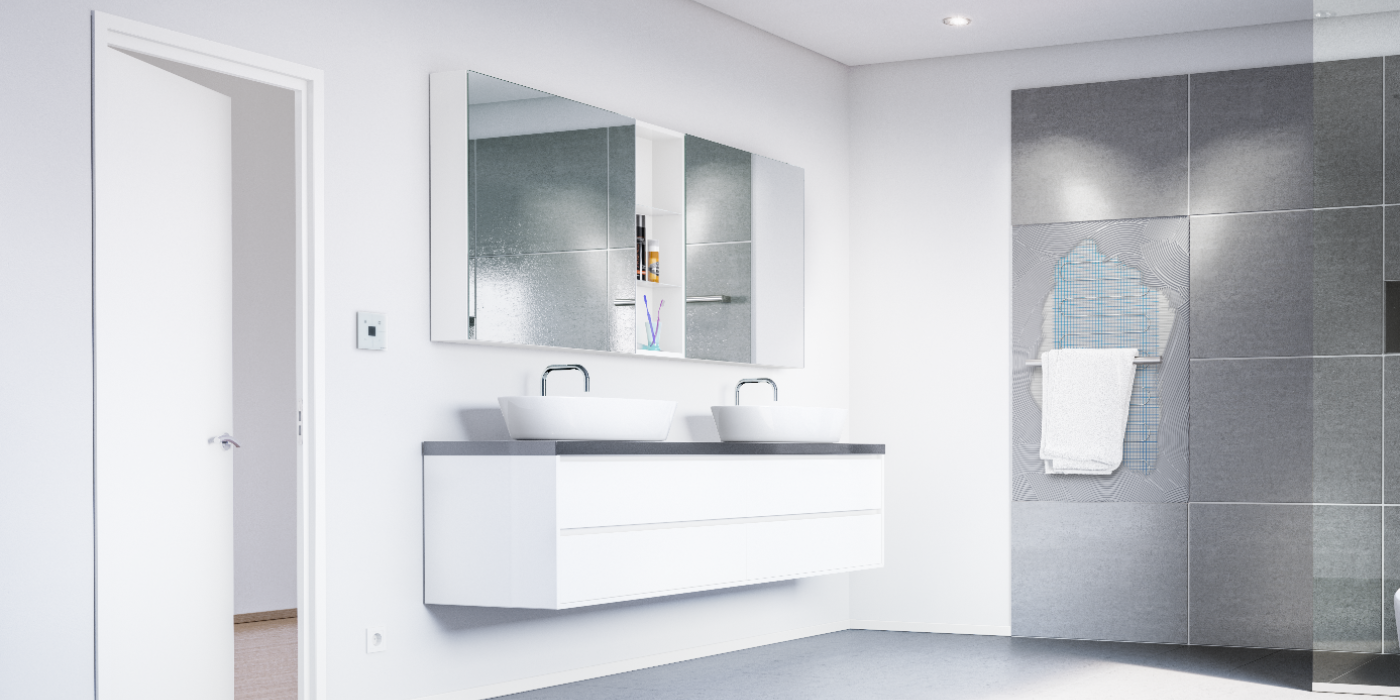 The innovative invisible towel rail is controlled by the built-in thermostat ETHERMA eTOUCH Hybrid with a sophisticated glass touch display, indirect LED lighting and two relay outputs – which, among other things, enables additional control of underfloor heating. The thermostat is included in the package price, but can also be purchased separately.